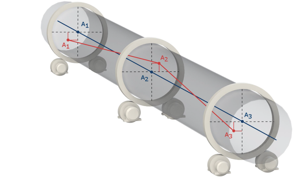 یکی از موارد بسیار مهم در کوره های سه پایه و بیشتر، تراز بودن محور کوره در دو صفحه قائم و افقی است. چنانچه محور کوره تراز نباشد توزیع بار بر روی غلتک ها متناسب نخواهد بود و در نتیجه تعدادی از یاتاقان ها در معرض فشار بیشتری قرار خواهند گرفت که این امر باعث افزایش دما و کاهش عمر یاتاقان خواهد شد. همچنین بار اعمال شده بر شفت غلتک ها افزایش خواهد یافت که میتواند تبعاتی از جمله ایجاد ترک و شکست شفت را به دنبال داشته باشد. یکی دیگر از اثرات مخرب تراز نبودن محور کوره، افزایش میزان تنش در بدنه کوره و در محل تماس رینگ و غلتک خواهد بود که سبب ایجاد ترک در بدنه کوره و سایش غیر نرمال رینگ و غلتک خواهد شد. کارشناسان این شرکت با استفاده از ابزار اندازه گیری با دقت بسیار بالا نسبت به تعیین موقعیت محور کوره در دو صفحه افقی و قائم اقدام خواهند نمود و میزان جابجایی لازم برای غلتک ها را به منظور اصلاح محور کوره تعیین خواهند نمود.